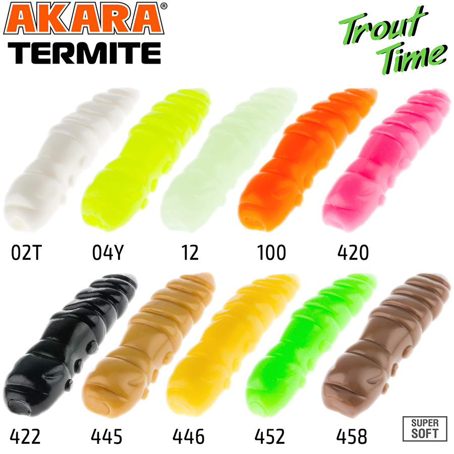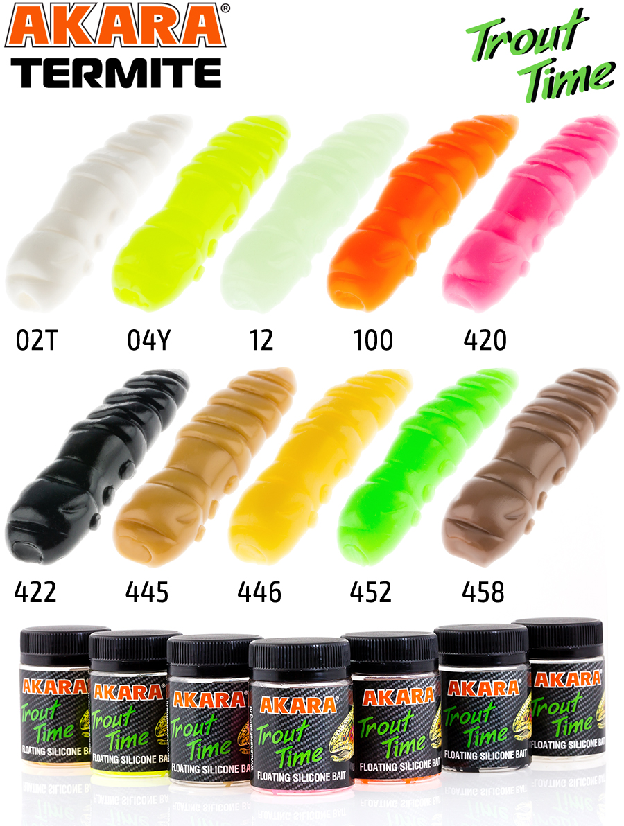Akara Trout Time TERMITE 1,5 – силиконовая приманка, имитирующая личинку насекомого, не имеет своей активной игры, поэтому требует активной анимации от рыбака. Подходит для ловли форели на платных водоемах. Работает как по хищной, так и мирной рыбе. Выпускается во вкусах Cheese (сыр) и Shrimp(креветка).