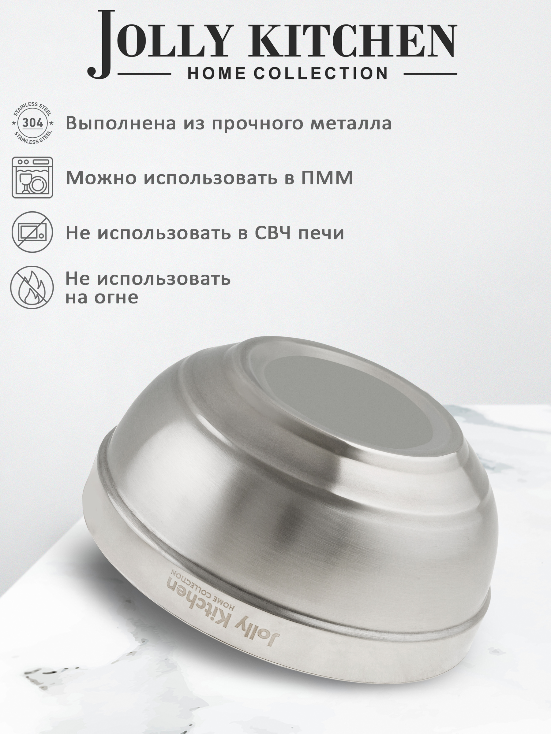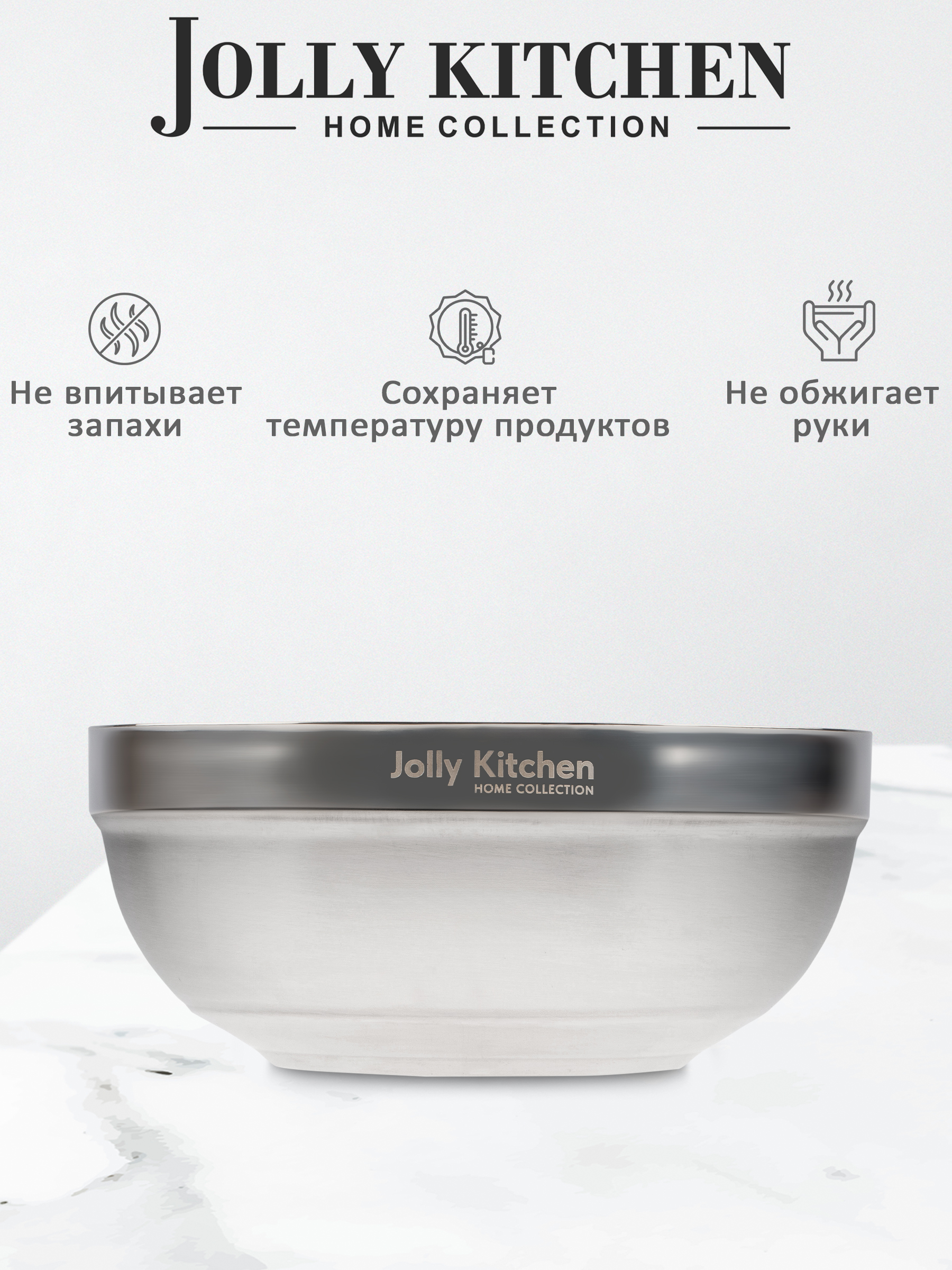 Кухонная миска Jolly Kitchen с двойными стенками – стильный и практичный аксессуар с зеркальной полировкой. Благодаря изотермическим свойствам сохраняет температуру содержимого и не обжигает руки, что идеально для горячих блюд и пикников. Выполнена из прочного металла, не впитывает запахи – подходит для маринования и хранения продуктов. Удобна для смешивания ингредиентов, нарезки овощей и сервировки. Можно мыть в посудомоечной машине. Ограничения: не подходит для СВЧ, плит и открытого огня. Элегантный дизайн делает её прекрасным подарком и украшением кухни.