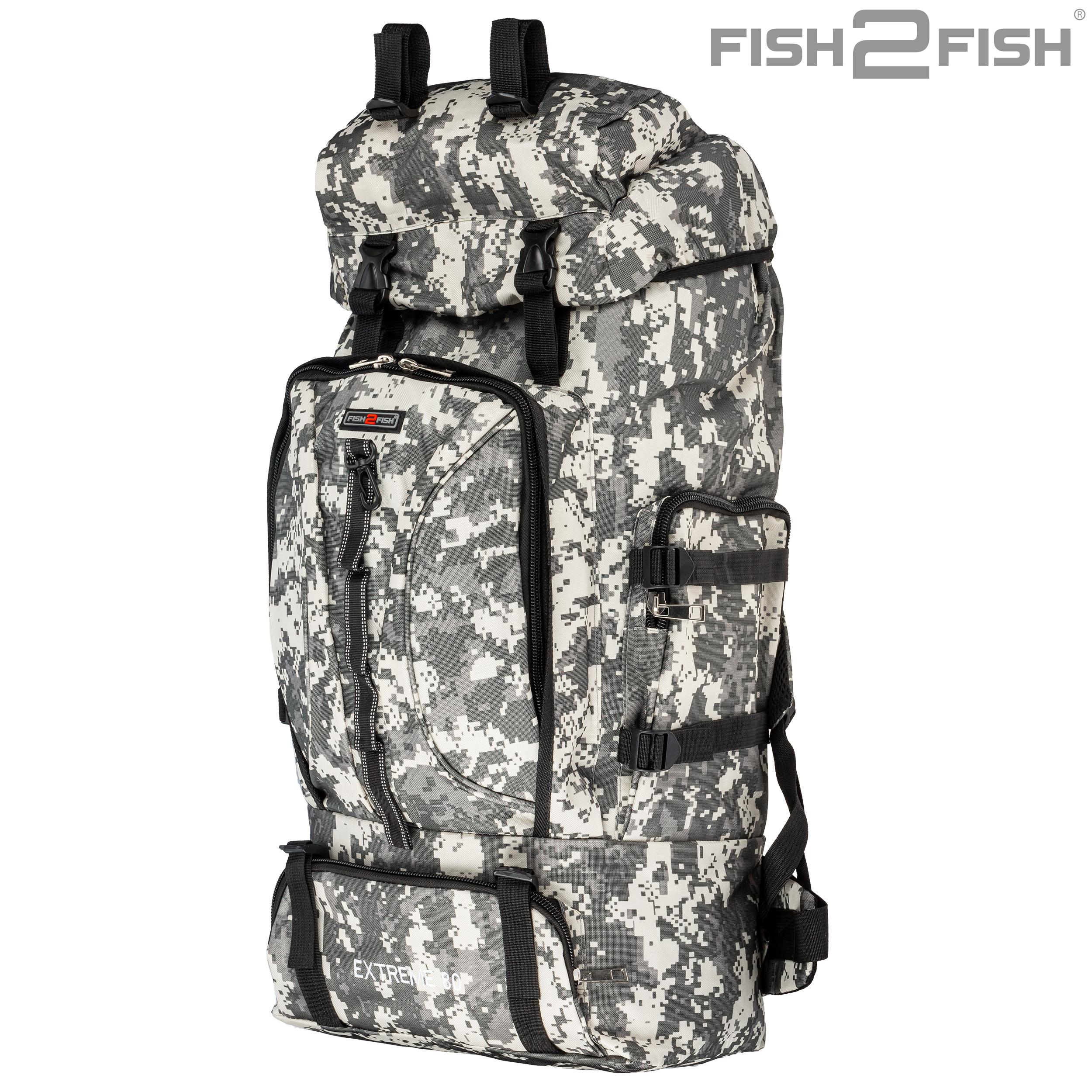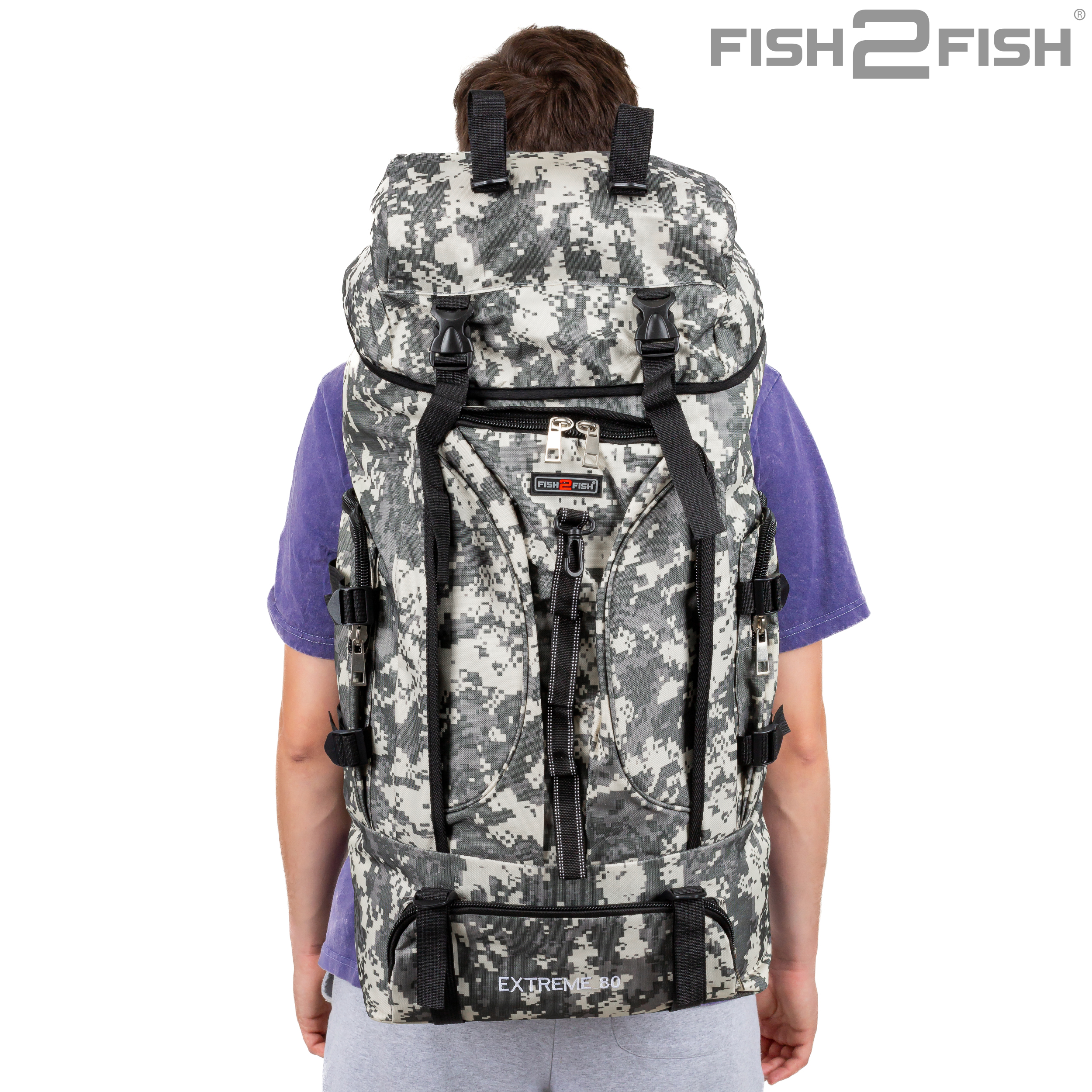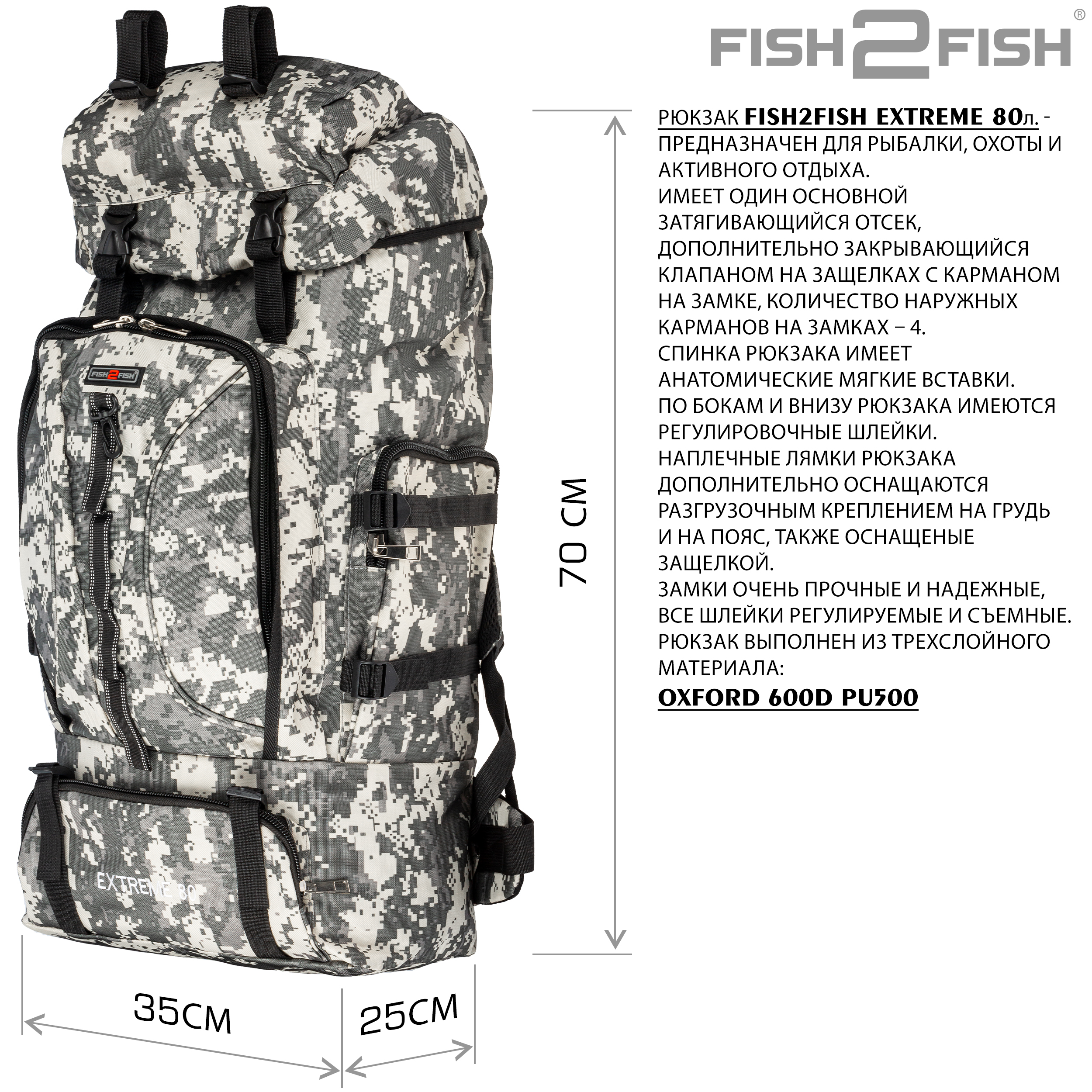 Рюкзак Fish2Fish Extreme серая цифра 80 л - предназначен для рыбалки, охоты и активного отдыха. Имеет один основной затягивающийся отсек, дополнительно закрывающийся клапаном на защелках с карманом на замке, количество наружных карманов на замках – 4. Спинка рюкзака имеет анатомические мягкие вставки. По бокам и внизу рюкзака имеются регулировочные шлейки. Наплечные лямки рюкзака дополнительно оснащаются разгрузочным креплением на грудь и на пояс, также оснащеные защелкой. Замки очень прочные и надежные, все шлейки регулируемые и съемные. Рюкзак выполнен из трехслойного материала: OXFORD 600D PU500 Высота – 70 см. Глубина – 25 см. Ширина – 35 см.