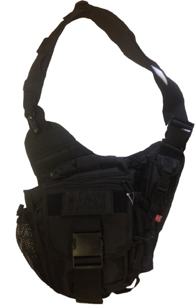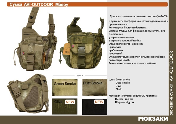 Сумка Mas?y . На сумке расположена платформа на липучках для именной и других нашивок. На лицевой, а так же боковой части сумки находятся петли типа MOLLE для навешивания дополнительного снаряжения. Сумка имеет 5 карманов на молнии и один на защелке Fast-Tex. В общей сложности сумка имеет 5 плоских карманов, 3 объемных и 1 основной. Размер основного отделения 203x165x76mm. Материал: Polyester 600 D PVC. Объем: 5 литров.
