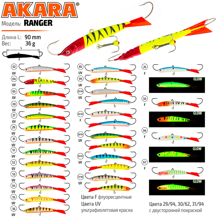 Балансир Akara Ranger 90 разработан для зимней ловли хищных рыб, таких как окунь и судак. Балансир изготовлен из качественных, морозостойких материалов и оснащен высокопрочными крючками и тройниками японской компании Maruto. Длина балансира 90мм, вес - 36г. Балансиры этой модели красятся в уловистые цвета, причем окрашивание осуществляется с применением флуоресцентных UV красок (светятся в ультрафиолетовом диапазоне), либо с использованием люминесцентных фосфорных красок (светятся в темноте). Балансир прекрасно отзывается на анимацию и имеет яркую, высокоамплитудную игру, которая может спровоцировать на поклевку даже пассивного хищника. Балансир Akara Ranger 90 станет прекрасным пополнением арсенала любителей зимней рыбалки.