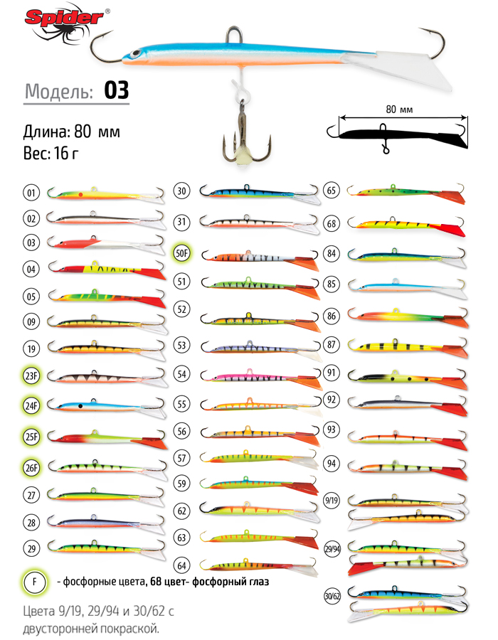 Балансир Spider Pro 03 обладает уникальной по плавности движений анимацией, которая очень нравится судаку, крупному окуню и щуке. На мормышечной игре балансир совершает круговые движения вокруг одной точки, исполняя так называемый «танец на хвосте». Все это делает эту приманку настоящей находкой для любителей зимней рыбалки. Балансир изготовлен из высококачественного полимера устойчивого к нагрузкам и оснащен тройниками японской марки Maruto. В хвостовой части балансира находится ударопрочный стабилизатор.
