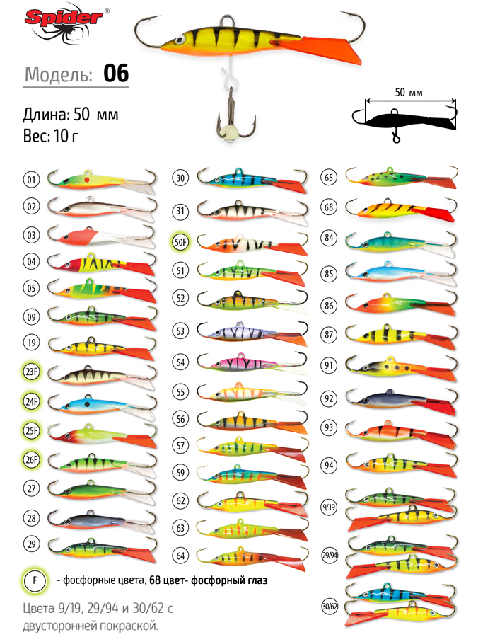 Балансир Spider Pro 06 - предназначен для зимней ловли окуня на большой глубине, но неплохо ловит и судака. Игра балансира хороша своей ритмичностью и повторяемостью, что очень нравится окуню. Балансир оснащен крючками и тройником Maruto (Япония).