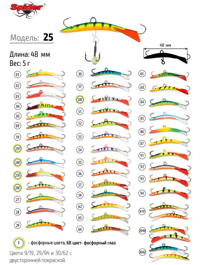 Балансир Spider Pro 25 - имеет «бананообразное» тело и выступающий нос, который также защищает носовой крючок от ударов о лед. Благодаря своей игре эта приманка в наибольшей степени подходит для ловли окуня. Балансир обладает уникальной постоянно повторяющейся игрой и будет полезен на рыбалке как опытным, так и начинающим рыболовам. Опытные рыболовы добьются значительного успеха, используя богатый арсенал возможных анимации этого балансира, а новички зимней рыбалки не останутся без добычи благодаря стабильной игре балансира при любых рывках. Балансир выполнен из морозостойких материалов и оснащен крючками и тройником Maruto (Япония).