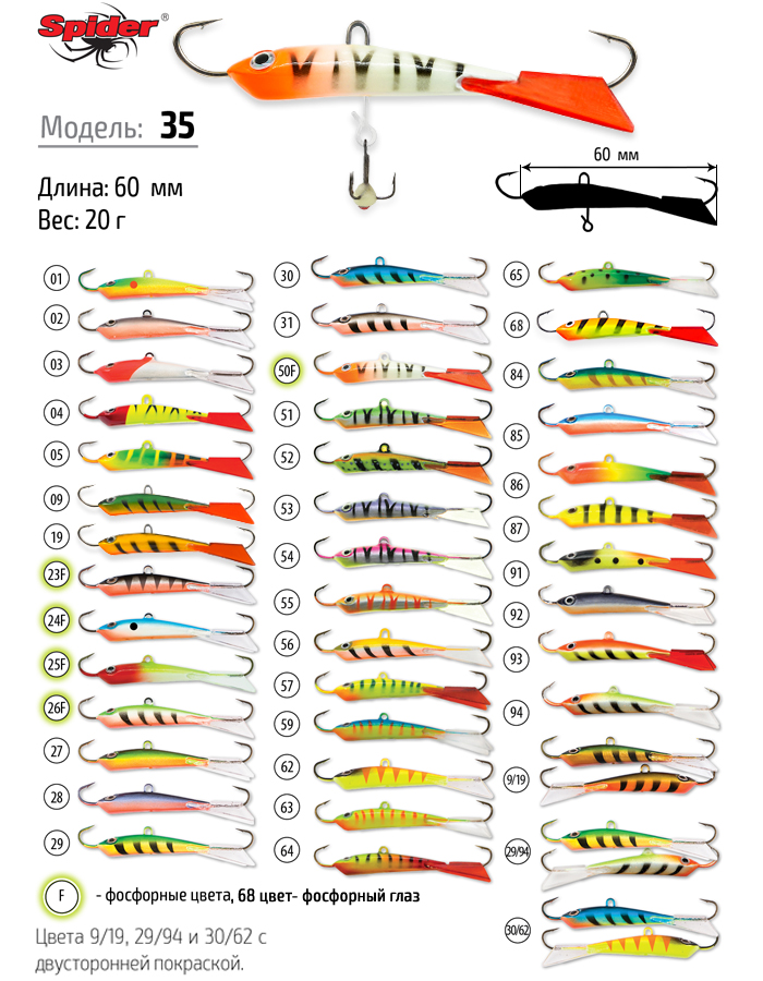 Балансир Spider, модели 8 и 35. Особенности - на резкой игре с большим подбросом балансиры уходят далеко в сторону, демонстрируя ярко выраженную «собирающую игру», позволяющую привлечь хищника с дальних расстояний. На мормышенье меньший балансир совершает классические «кивки», а крупный совершает редкий для таких приманок «танец на хвосте». Оба балансира имеют характерную игру и подойдут всем рыболовам ввиду своей универсальности.