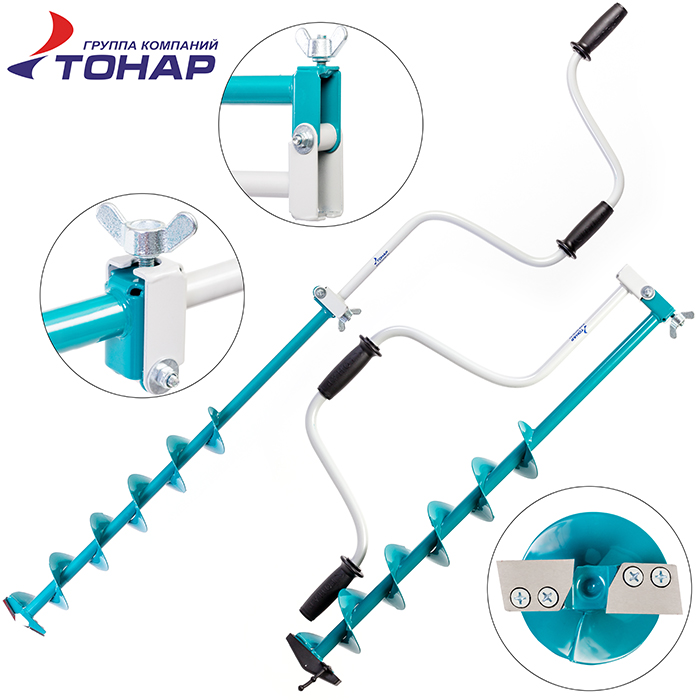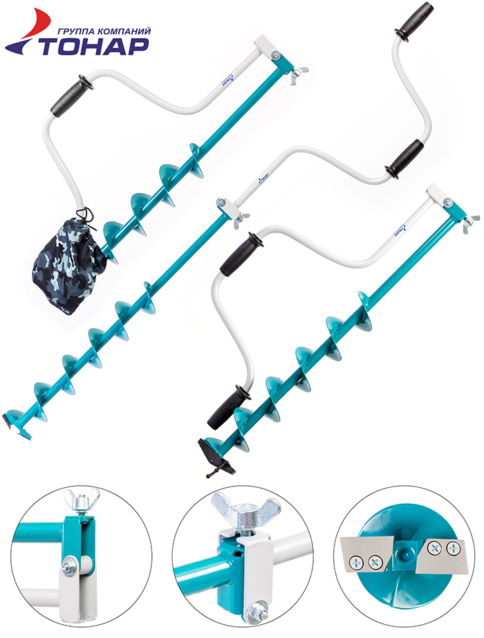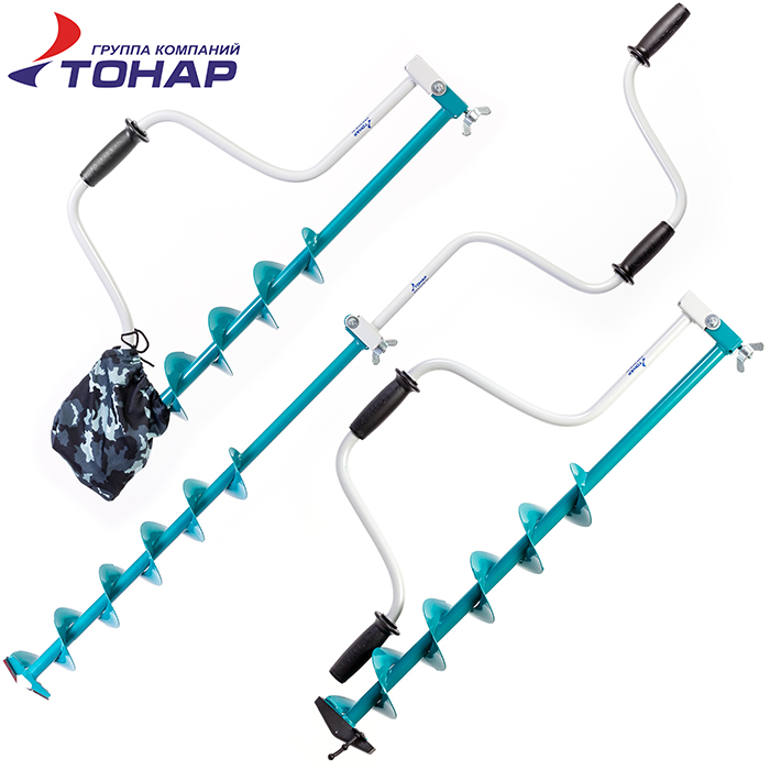 Ледобур Тонар ЛР-100. Вращение ледобура – левое (против часовой стрелки), верхняя ручка совпадает с осью ледобура (это удобнее и позволяет затрачивать меньше усилий). При складывании в транспортном положении рукоятка и шнек имеют одинаковую длину, поэтому ледобур удобен при транспортировке. Классические ледобуры являются наиболее популярными среди рыболовов. Оригинальные конструкторские и технологические решения (конструкция ледобура защищена тремя патентами РФ) позволили создать универсальный ледобур, подходящий для любых условий рыбалки. Высокая скорость бурения, минимум прилагаемых усилий в сочетании с выдающейся надежностью и прочностью определили выбор десятков и сотен тысяч рыболовов всей России в пользу Барнаульского ледобура. Диаметр бурения – 100 мм, глубина бурения – 1000 мм, вес ледобура – 2.3 +/-0.2 кг.