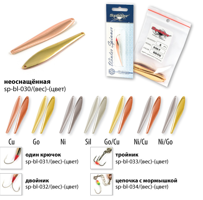 Коллекция зимних блёсен для вертикального блеснения от Spider, прошла многолетнюю селекцию и представляет все самое лучшее, что было создано из блесен для зимней рыбалки на данный момент. Все блёсна цельнометаллические, изготовленные методом холодной ковки из латуни. Благодаря новым технологиям производства удалось добиться максимально реалистичной и стабильной игры приманки, на рыболовном сленге это называется «блесна звенит». Проверенные временем классические модели, а так же уловистые новинки позволяют рыболову каждый раз добиваться успеха на рыбалке.