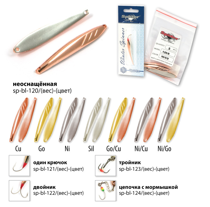 Коллекция зимних блёсен для вертикального блеснения от Spider, прошла многолетнюю селекцию и представляет все самое лучшее, что было создано из блесен для зимней рыбалки на данный момент. Все блёсна цельнометаллические, изготовленные методом холодной ковки из латуни. Благодаря новым технологиям производства удалось добиться максимально реалистичной и стабильной игры приманки, на рыболовном сленге это называется «блесна звенит». Проверенные временем классические модели, а так же уловистые новинки позволяют рыболову каждый раз добиваться успеха на рыбалке.