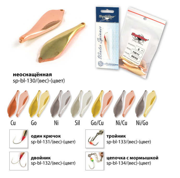 Коллекция зимних блёсен для вертикального блеснения от Spider, прошла многолетнюю селекцию и представляет все самое лучшее, что было создано из блесен для зимней рыбалки на данный момент. Все блёсна цельнометаллические, изготовленные методом холодной ковки из латуни. Благодаря новым технологиям производства удалось добиться максимально реалистичной и стабильной игры приманки, на рыболовном сленге это называется «блесна звенит». Проверенные временем классические модели, а так же уловистые новинки позволяют рыболову каждый раз добиваться успеха на рыбалке.