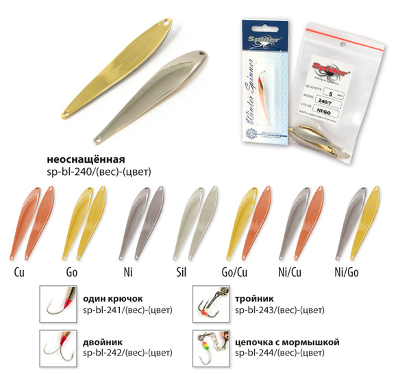 Коллекция зимних блёсен для вертикального блеснения от Spider, прошла многолетнюю селекцию и представляет все самое лучшее, что было создано из блесен для зимней рыбалки на данный момент. Все блёсна цельнометаллические, изготовленные методом холодной ковки из латуни. Благодаря новым технологиям производства удалось добиться максимально реалистичной и стабильной игры приманки, на рыболовном сленге это называется «блесна звенит». Проверенные временем классические модели, а так же уловистые новинки позволяют рыболову каждый раз добиваться успеха на рыбалке.