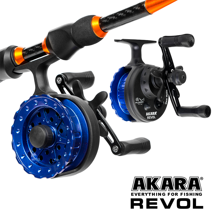 Катушка мультипликаторная зимняя Akara Revol 4+1 bb L под левую руку. Мультипликаторная катушка для оснащения зимних удочек для отвесной ловли. Катушка позволяют вываживать рыбу с глубины, используя только катушку, как при ловле на спиннинг – тащить рыбу руками за леску не обязательно. Шпули открытые, позволяют зрительно контролировать намотку лески на шпулю. Катушки не снабжены лесоукладывателем. Облегченная пластиковая шпуля. Облегченный корпус. Дисковый фрикцион. Мгновенный тормоз. Диаметр шпули 60 мм.