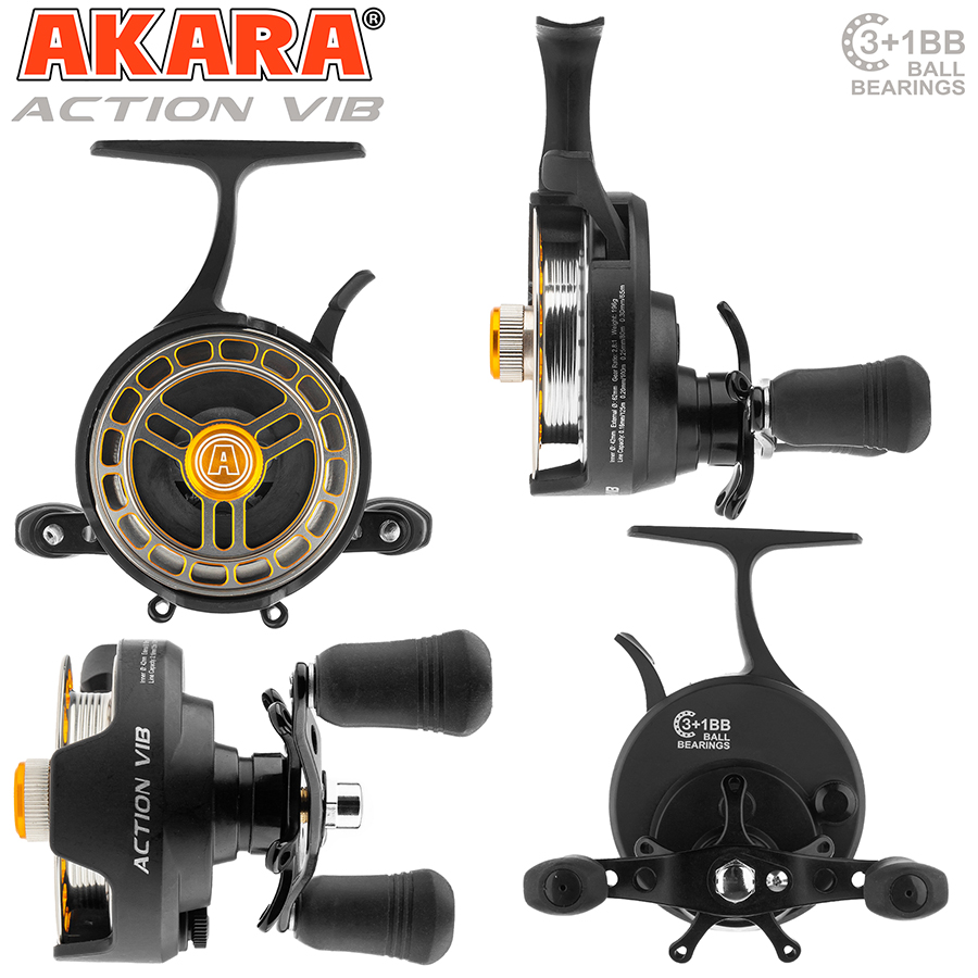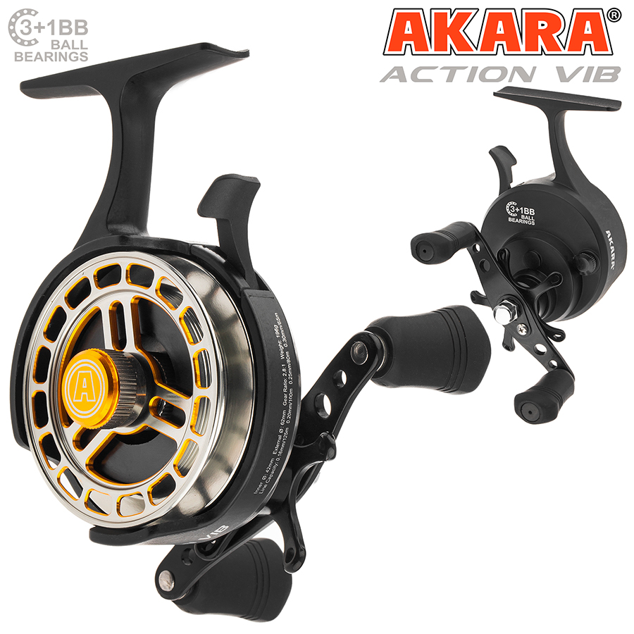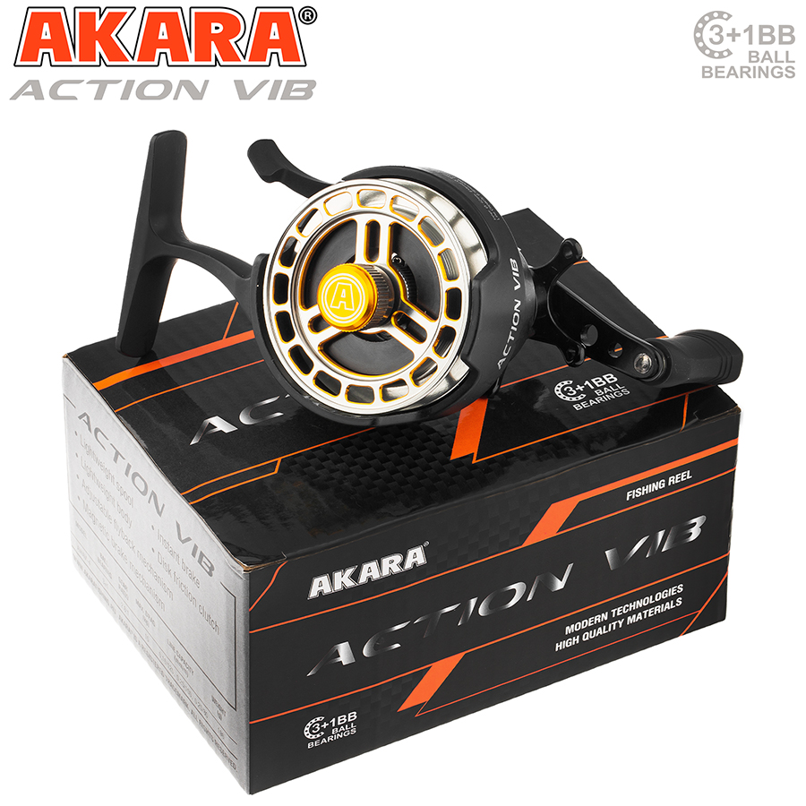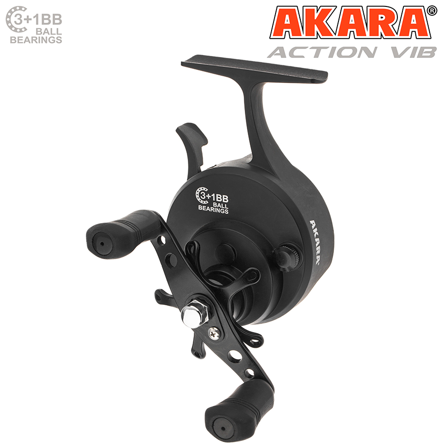 Катушка мультипликаторная зимняя Akara Action Vib 3+1 bb с курком. Мультипликаторная катушка для оснащения зимних удочек для отвесной ловли. Катушка позволяют вываживать рыбу с глубины, используя только катушку, как при ловле на спиннинг - тащить рыбу руками за леску не обязательно. Шпули открытые, позволяют зрительно контролировать намотку лески на шпулю. Катушки не снабжены лесоукладывателем. Отличительной особенностью катушек является удлинённая ножка, которая даёт достаточную свободу для пальцев при удержании удочки в процессе вываживания. Пластиковая шпуля. Облегченный корпус. Магнитный тормоз. Регулируемый механизм обратного хода. Дисковый фрикцион. Мгновенный тормоз. Максимальная нагрузка 15 кг.