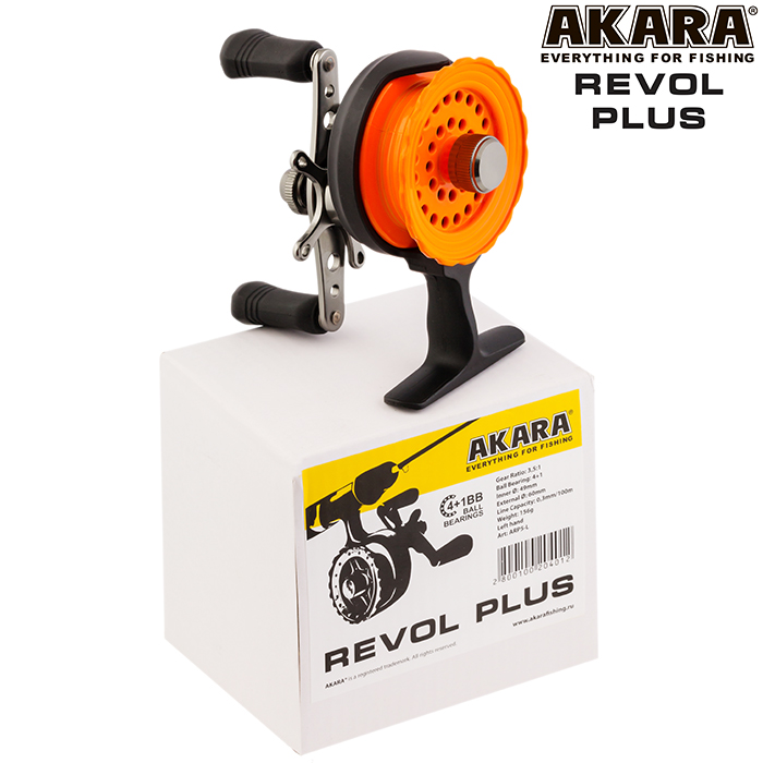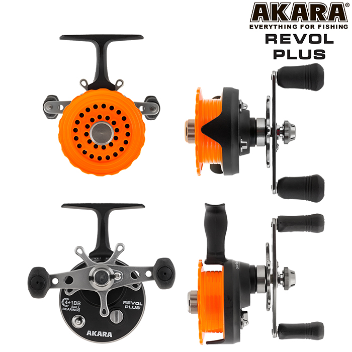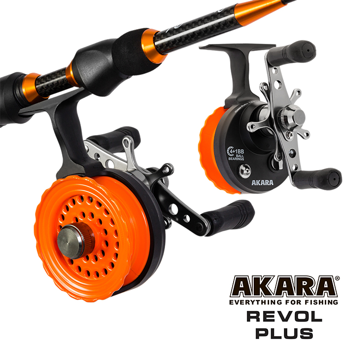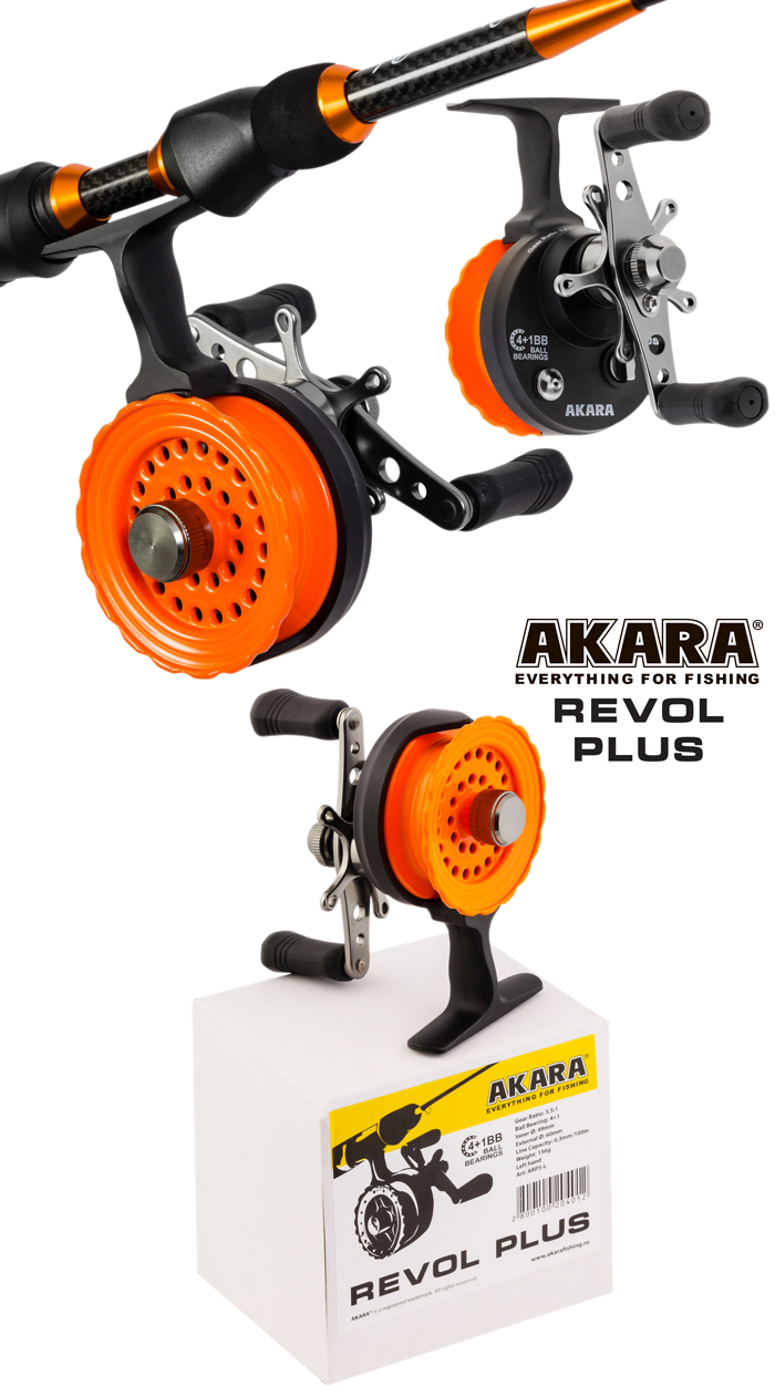 Катушка мультипликаторная зимняя Akara Revol Plus 4+1bb. Мультипликаторная катушка для оснащения зимних удочек для отвесной ловли. Катушка позволяют вываживать рыбу с глубины, используя только катушку, как при ловле на спиннинг – тащить рыбу руками за леску не обязательно. Шпули открытые, позволяют зрительно контролировать намотку лески на шпулю. Катушки не снабжены лесоукладывателем. Отличительной особенностью катушек является удлинённая ножка, которая даёт достаточную свободу для пальцев при удержании удочки в процессе вываживания.