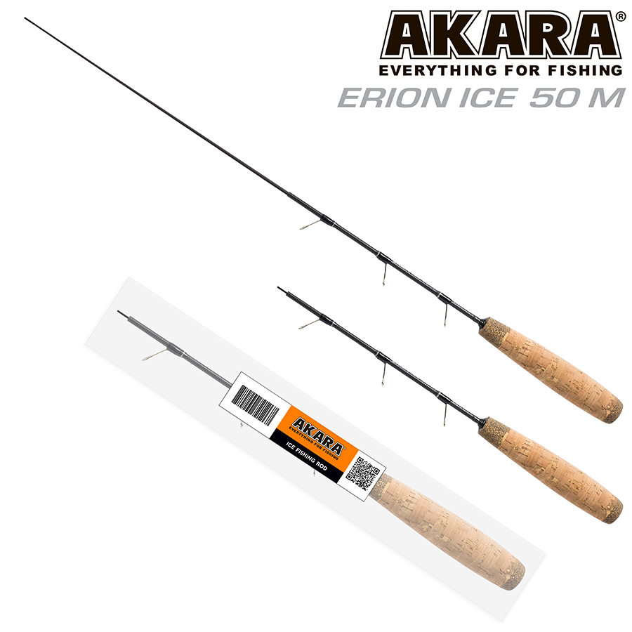 Удочка зимняя 2 колена Akara Erion Ice 50 M. Зимняя удочка для блеснения, отличительной особенностью, которой является отсутствие катушки, так как леска наматывается прямо на хлыст, на котором для этого сделаны специальные лапки. Это значительно упрощает конструкцию, благодаря чему, удочка получилась очень легкой. Для удобства транспортировки, хлыстик выполнен в телескопическом исполнении и состоит из двух колен. Удочка сделана в двух длинах 50 и 60 см и в двух вариантах жесткости. Для удобства крепления снасти, на кончике хлыстика установлен специальный силиконовый кембрик, яркого цвета.