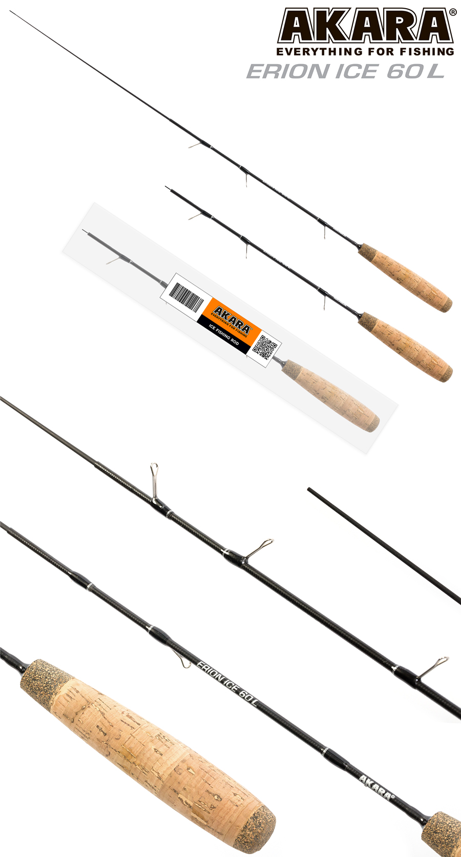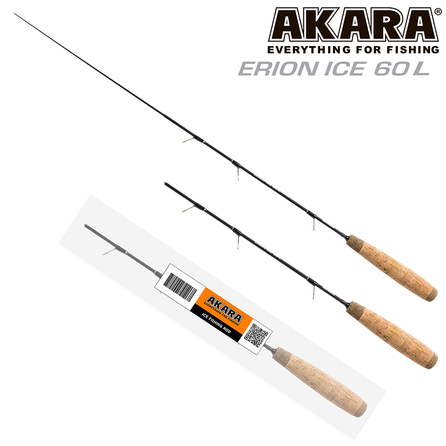 Удочка зимняя 2 колена Akara Erion Ice 60 L. Зимняя удочка для блеснения, отличительной особенностью, которой является отсутствие катушки, так как леска наматывается прямо на хлыст, на котором для этого сделаны специальные лапки. Это значительно упрощает конструкцию, благодаря чему, удочка получилась очень легкой. Для удобства транспортировки, хлыстик выполнен в телескопическом исполнении и состоит из двух колен. Удочка сделана в двух длинах 50 и 60 см и в двух вариантах жесткости. Для удобства крепления снасти, на кончике хлыстика установлен специальный силиконовый кембрик, яркого цвета.