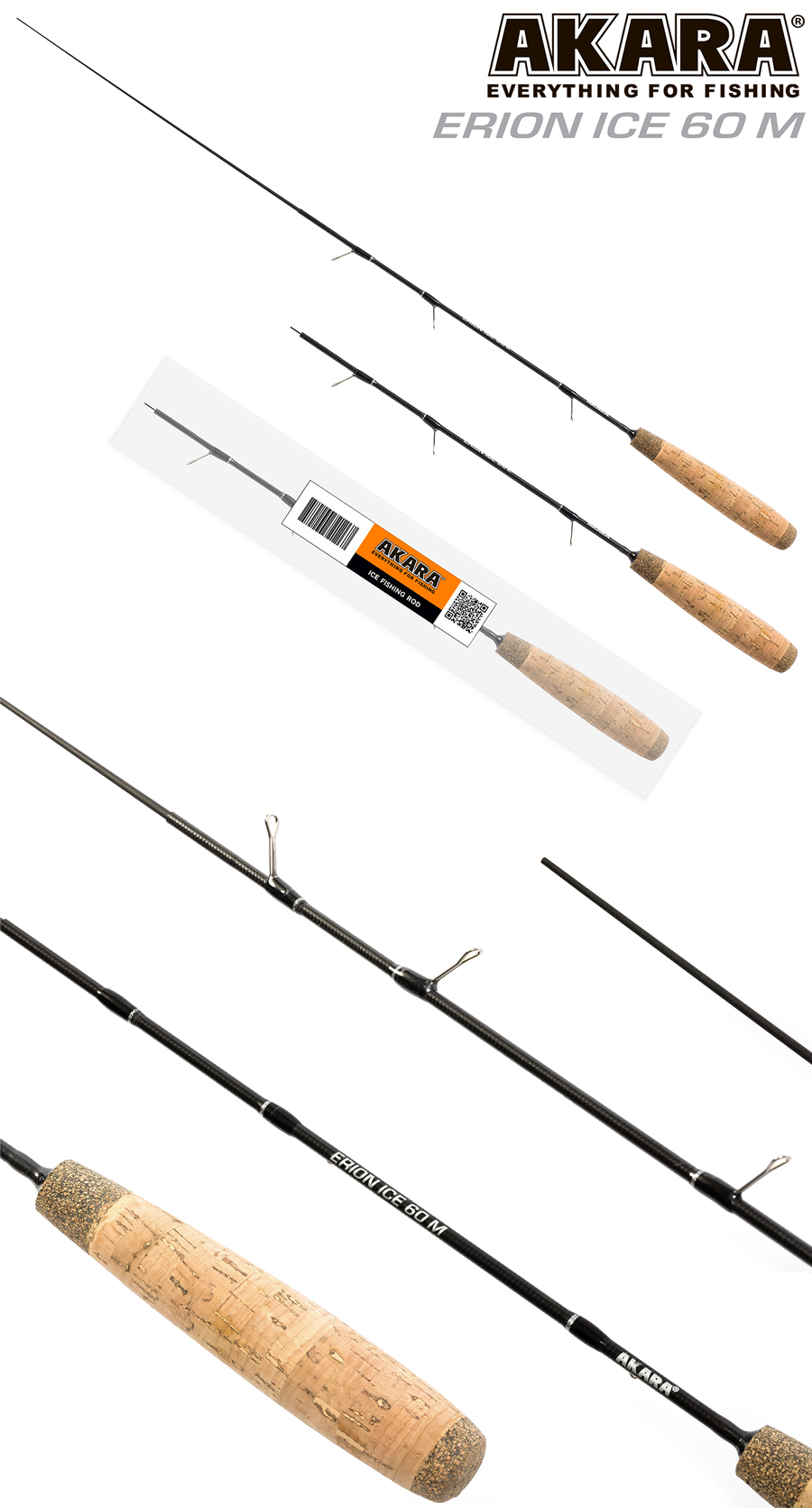 Удочка зимняя 2 колена Akara Erion Ice 60 M. Зимняя удочка для блеснения, отличительной особенностью, которой является отсутствие катушки, так как леска наматывается прямо на хлыст, на котором для этого сделаны специальные лапки. Это значительно упрощает конструкцию, благодаря чему, удочка получилась очень легкой. Для удобства транспортировки, хлыстик выполнен в телескопическом исполнении и состоит из двух колен. Удочка сделана в двух длинах 50 и 60 см и в двух вариантах жесткости. Для удобства крепления снасти, на кончике хлыстика установлен специальный силиконовый кембрик, яркого цвета.