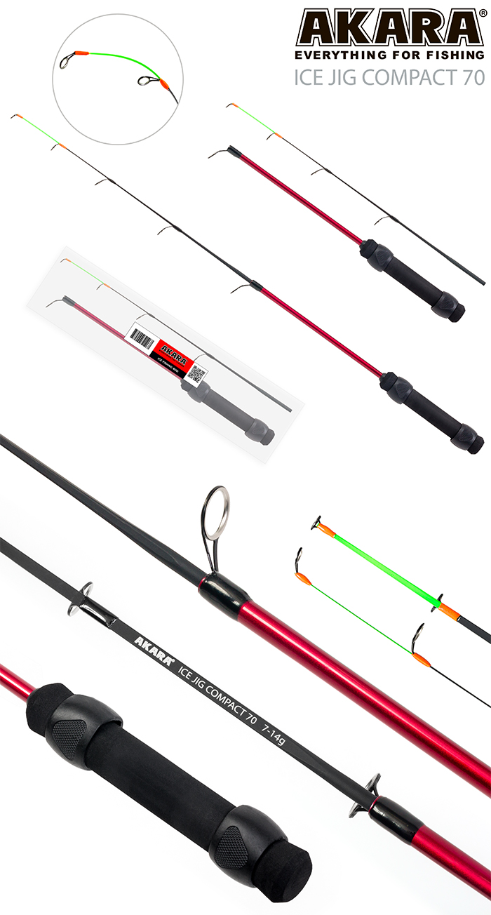 Akara Ice Jig Compact зимняя удочка для блеснения, выполненная в штекерном исполнении, под катушку. Рукоятка из неопрена, поэтому ее комфортно держать рукой на морозе. Бывает в двух длинах 55 см и 70 см. А так же в четырех тестах, от самых легких 3-7 г, до тяжелых 25-50г. Поэтому имея набор таких удилищ, вы сможете ловить всю рыбу, попадающуюся в наших водоемах. Летом эта удочка может использоваться как бортовая, причем ей не нужен кивок, так как верхняя часть колена очень чувствительна, впрочем, это касается и зимней рыбалки. Штекерная зимняя удочка Akara Ice Jig Compact. Тест 14г. Длина 70 см.