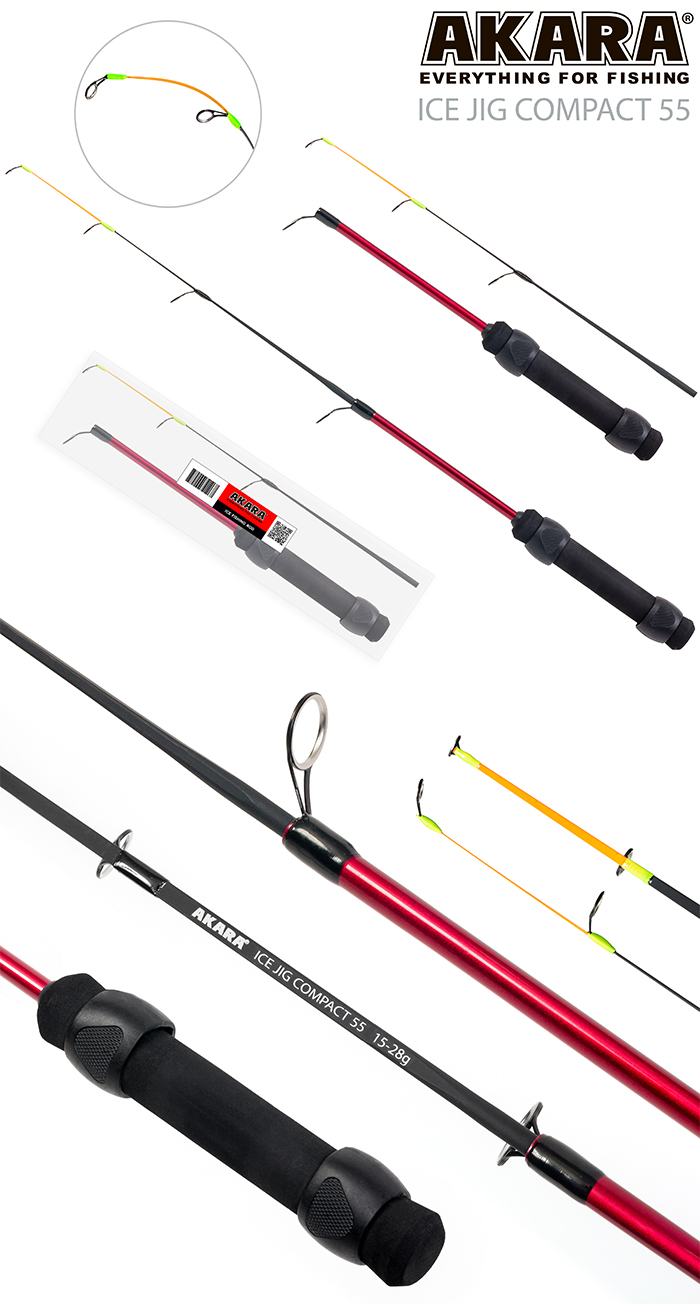 Akara Ice Jig Compact зимняя удочка для блеснения, выполненная в штекерном исполнении, под катушку. Рукоятка из неопрена, поэтому ее комфортно держать рукой на морозе. Бывает в двух длинах 55 см и 70 см. А так же в четырех тестах, от самых легких 3-7 г, до тяжелых 25-50г. Поэтому имея набор таких удилищ, вы сможете ловить всю рыбу, попадающуюся в наших водоемах. Летом эта удочка может использоваться как бортовая, причем ей не нужен кивок, так как верхняя часть колена очень чувствительна, впрочем, это касается и зимней рыбалки. Штекерная зимняя удочка Akara Ice Jig Compact. Тест 28г. Длина 55 см.