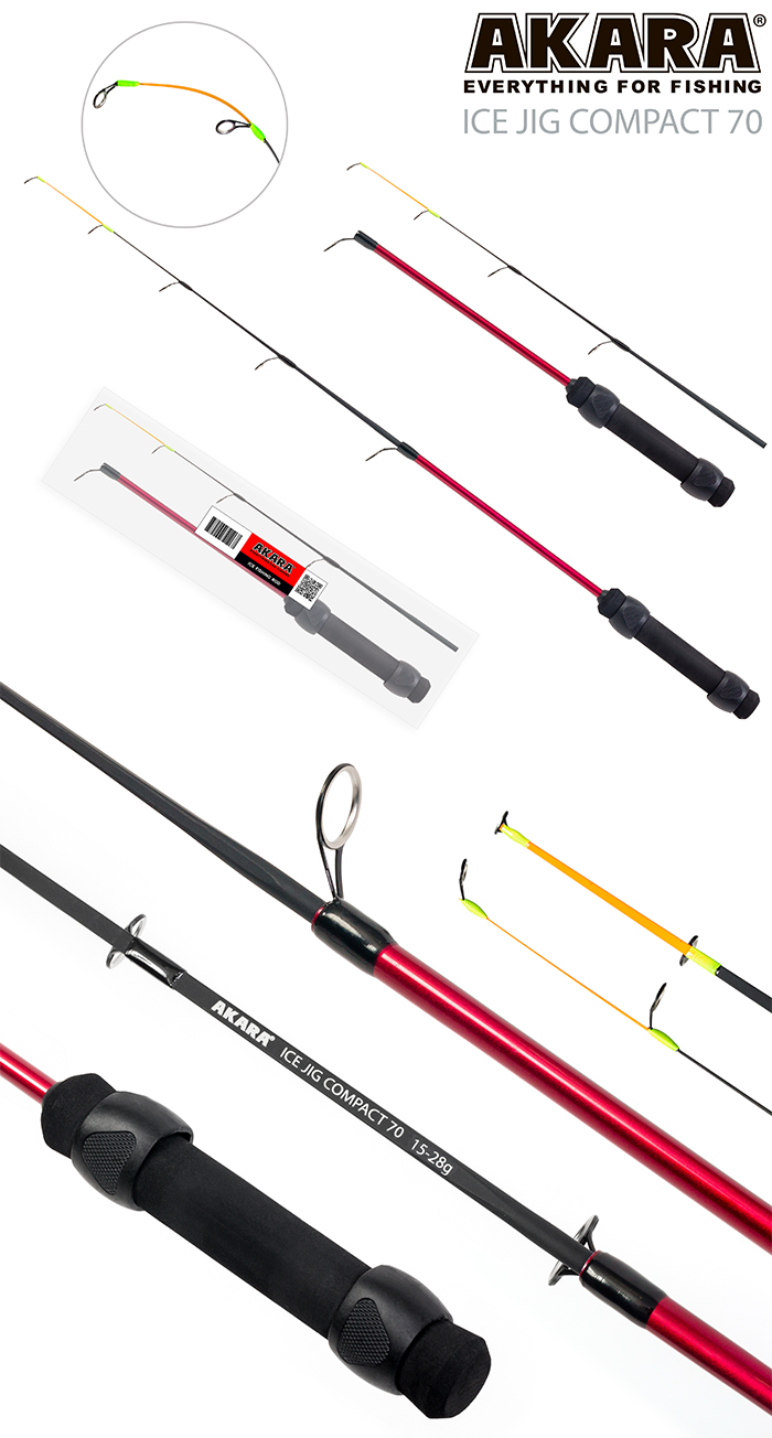 Akara Ice Jig Compact зимняя удочка для блеснения, выполненная в штекерном исполнении, под катушку. Рукоятка из неопрена, поэтому ее комфортно держать рукой на морозе. Бывает в двух длинах 55 см и 70 см. А так же в четырех тестах, от самых легких 3-7 г, до тяжелых 25-50г. Поэтому имея набор таких удилищ, вы сможете ловить всю рыбу, попадающуюся в наших водоемах. Летом эта удочка может использоваться как бортовая, причем ей не нужен кивок, так как верхняя часть колена очень чувствительна, впрочем, это касается и зимней рыбалки. Штекерная зимняя удочка Akara Ice Jig Compact. Тест 28г. Длина 70 см.