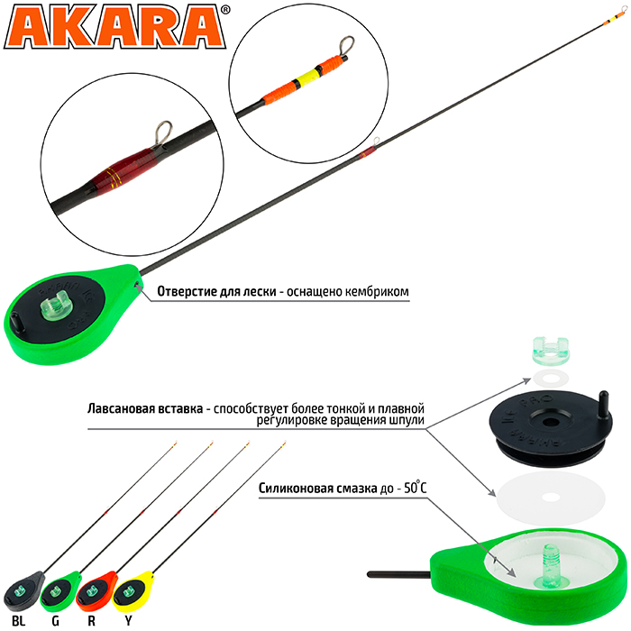 Akara Ice Pro - классическая зимняя удочка, по типу балалайка. Оснащена углепластиковым хлыстом и пропускным кольцом. Предназначена для ловли на блесну. Вес 10г.