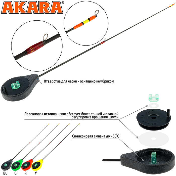 Akara SPCS -классическая зимняя удочка, по типу балалайка. Оснащена углепластиковым хлыстом и пропускными кольцами. Предназначена для ловли на блесну. Вес 10г.