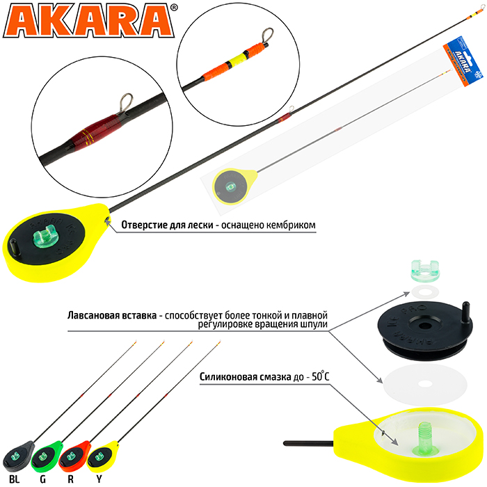 Akara SPCS -классическая зимняя удочка, по типу балалайка. Оснащена углепластиковым хлыстом и пропускными кольцами. Предназначена для ловли на блесну. Вес 10г.