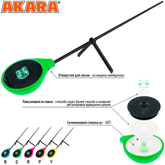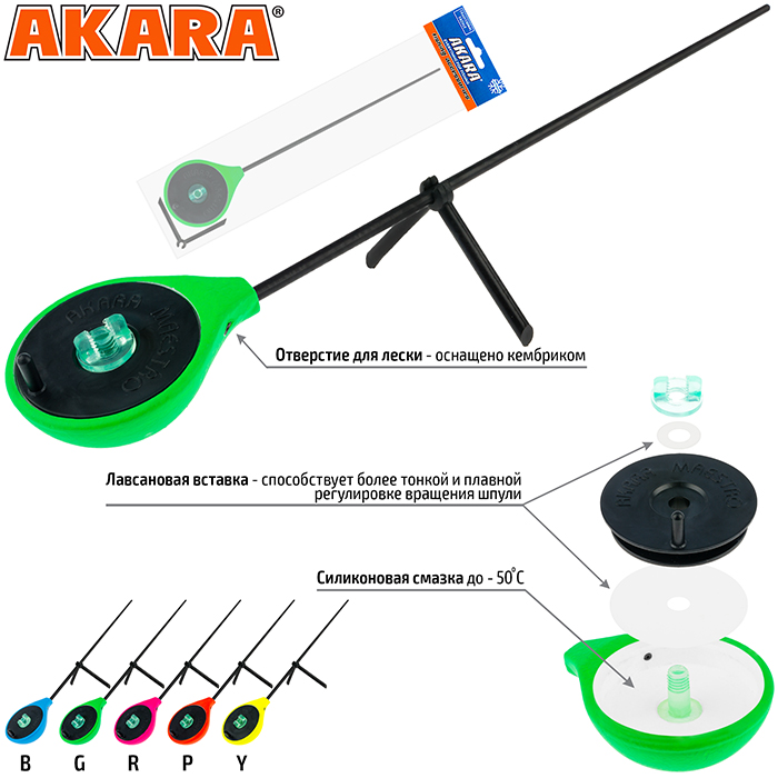 Удочка зимняя Akara Universal PK. Корпус катушки компактный и обтекаемый, удочка очень удобно лежит в руке. Выполнена из прочного пенопласта в трех расцветках (зеленый, красный, желтый). Механизм вращения шпули простой, но надежный (две пластиковые прокладки и зажимная гайка.). В отверстие для лески на корпусе вставлен кембрик, который не дает врезаться леске в пенопласт под нагрузкой. Хлыст изготовлен из прочного морозостойкого пластика. Съемные пластиковые ножки в комплекте. Общая длина 24 см. Длина хлыста 17,5 см. Вес 16,8г.