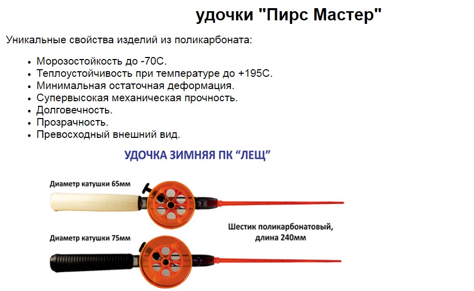 Удочки зимние Лещ ПК 68 и ПК 75. Морозостойкость до -70С. Теплоустойчивость при температуре до +195С. Минимальная остаточная деформация. Супервысокая механическая прочность. Долговечность. Прозрачность. Превосходный внешний вид.
